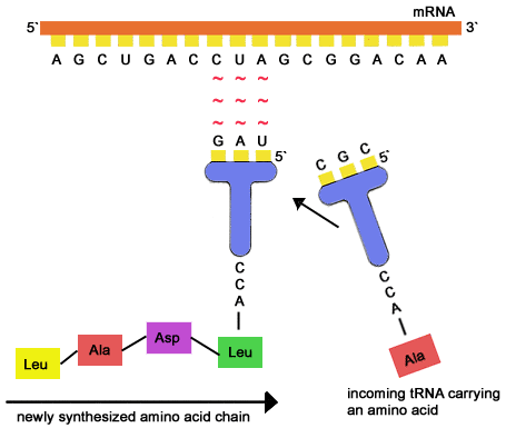 Por exemplo, moléculas de RNAt com anticódon AAA ou AAG transportam sempre o aminoácido fenilalanina; os RNAt com anticódons CCA, CCG, CCU ou CCC transportam somente glicina.